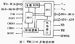TMC2310由两个算术单元(AE0、AE1)、片内系数ROM、控制逻辑单元和外部接口电路五个主要部分构成,其逻辑框图见图1。每个算术单元包括一个乘法序列电路和乘—加算术逻辑电路块。该芯片采用了88引脚的PGA封装形式。