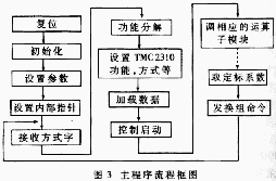 软件主要由一个主程序与若干个子程序模块组成。主要的模块有:TMC2310的设置与控制;与外部的通讯;数据的输出、数据加载、系数加载及十几个运算子模块。由于篇幅有限,以下仅给出主程序流程框图(见图3)。